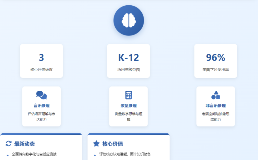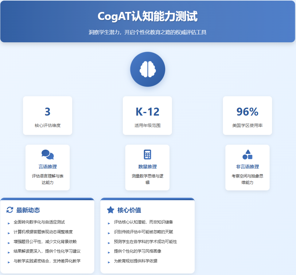 在教育评估领域,认知能力测试一直是识别学生学术潜力、个性化学习路径的关键工具。其中,CogAT作为美国乃至国际范围内广泛使用的权威测试,其动态与改革始终备受家长和教育者关注。本文将为您带来关于CogAT测试的最新资讯、核心价值及前瞻性备考建议