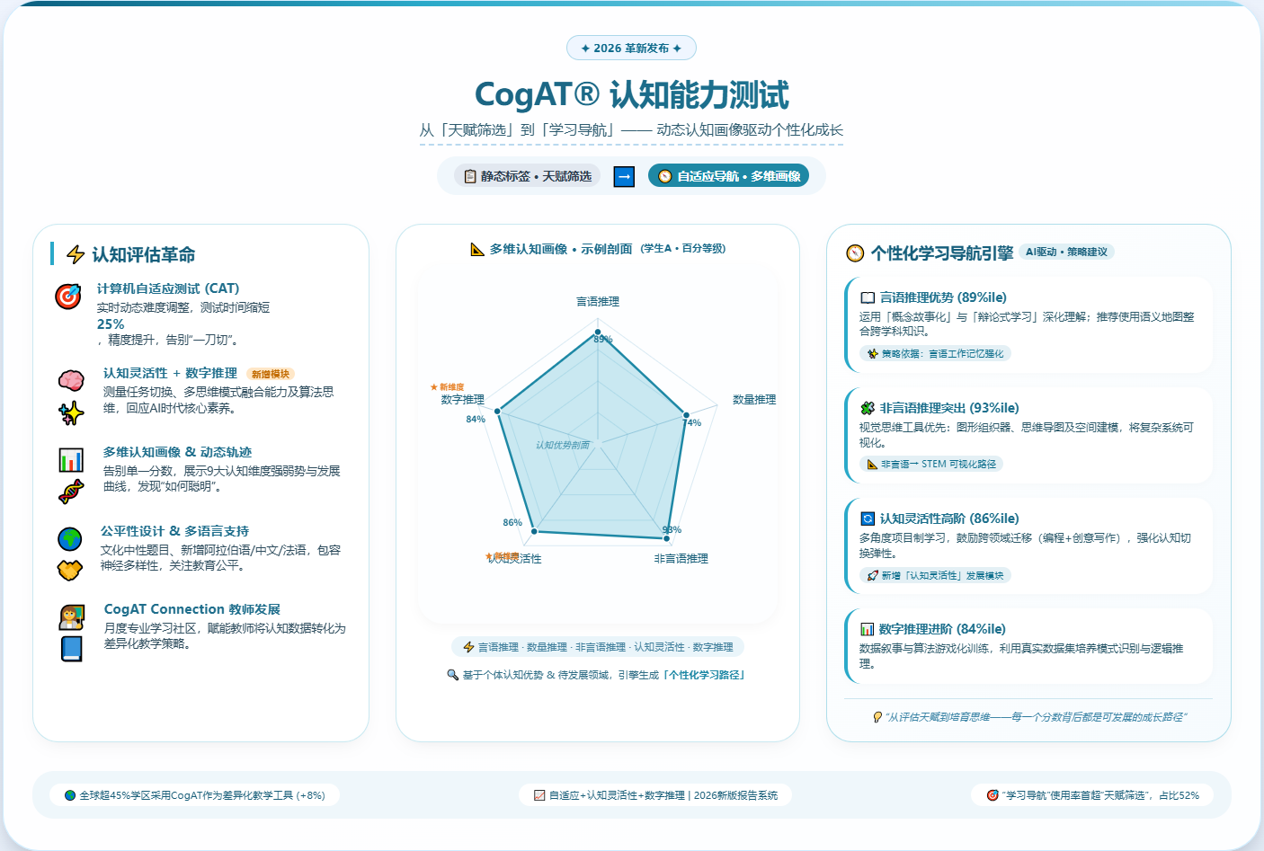 2026年,全球应用最广泛的认知能力评估工具之一CogAT(Cognitive Abilities Test)正在经历一场深刻变革。从测试内容、技术架构到评分报告系统,乃至全球分销渠道,这场革新标志着认知能力评估理念的根本性转变——从传统的“天赋标签化”走向“学习过程导航”。