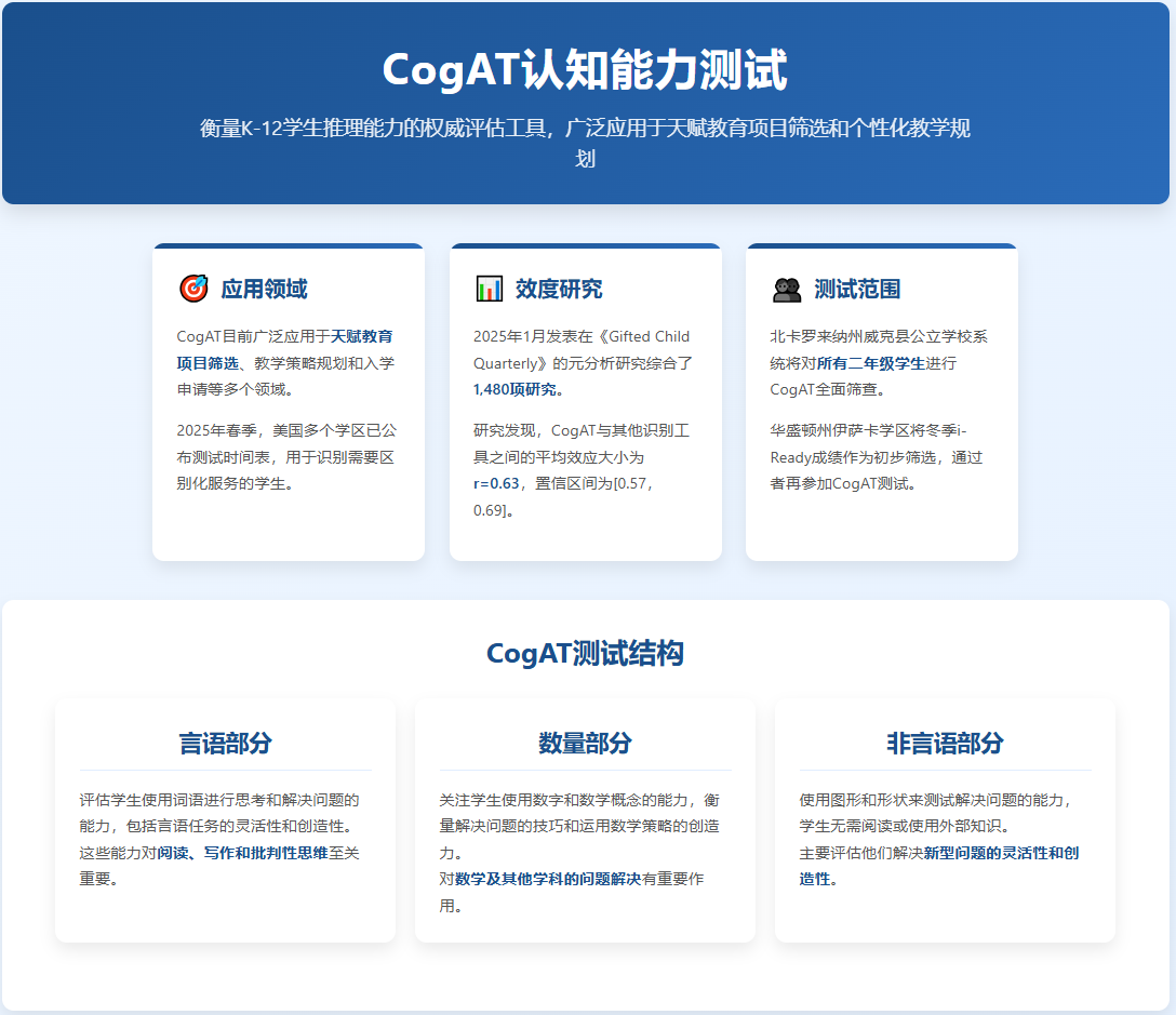 近期,美国多个学区陆续发布2025年CogAT测试安排,涵盖二年级普通筛查到高年级天赋项目申请。 Cognitive Abilities Test作为一项衡量学生推理能力的评估工具,在教育决策中的作用日益凸显。