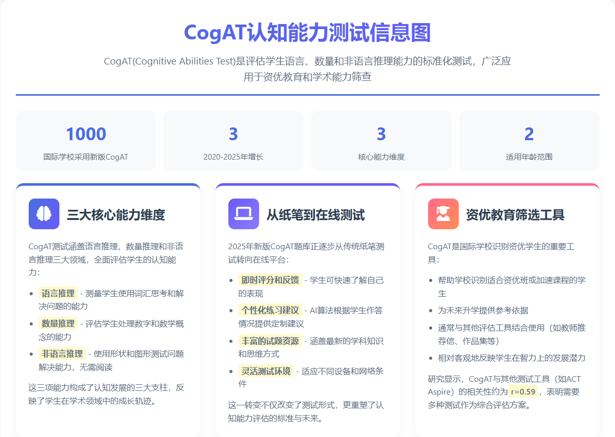 这些变化不仅仅体现在测试形式上,更体现在评估理念的转变——从单一的分数判断,转向多维度的能力分析;从静态的纸笔测试,转向动态的个性化学习路径规划。CogAT的演进,正悄然改变着全球教育评估的格局。
