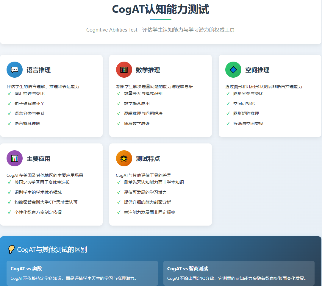 🆚 与奥数的区别:CogAT不依赖于特定的学科知识,它评估的是学生天生的学习与推理潜力。一个学生可能奥数成绩一般,但在CogAT的空间推理部分表现出色,这能帮助家长和老师发现他未被开发的潜力。